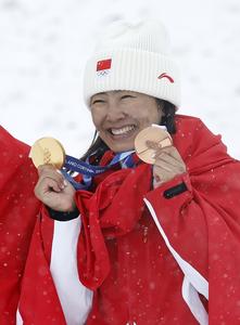 (260218) — LIVIGNO, 18 febrero, 2026 (Xinhua) — La medallista de oro, Xu Mengtao, de China, reacciona durante la ceremonia de premiación de aerials femenino de esquí acrobático en los Juegos Olímpicos de Invierno Milán-Cortina 2026, en Livigno, Italia, el 18 de febrero de 2026. (Xinhua/Zhang Hongxiang) (ah) (ra) (ce)