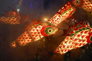 (260303) -- SHEXIAN, 3 marzo, 2026 (Xinhua) -- Imagen del 1 de marzo de 2026 de aldeanos desfilando con linternas con forma de pez, en la aldea de Wangmantian, en el distrito de Shexian, en la ciudad de Huangshan de la provincia de Anhui, en el este de China. Residentes de Shexian tienen la tradición de fabricar linternas con forma de pez, un patrimonio cultural inmaterial, en los días festivos para orar por la cosecha y la buena fortuna. (Xinhua/Shi Yalei) (ah) (ce)