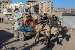 (250521) -- GAZA, 21 mayo, 2025 (Xinhua) -- Personas desplazadas son vistas en un refugio temporal en la zona del...