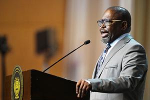(250521) -- CIUDAD DEL CABO, 21 mayo, 2025 (Xinhua) -- El ministro de Finanzas sudafricano, Enoch Godongwana, pronuncia su discurso...