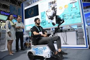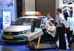 (250521) -- XI'AN, 21 mayo, 2025 (Xinhua) -- Un visitante experimenta un simulador de conducción durante la Novena Exposición Internacional...