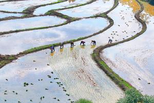 (250521) -- BEIJING, 21 mayo, 2025 (Xinhua) -- Agricultores trasplantan plántulas de arroz en los campos de arroz, en el...