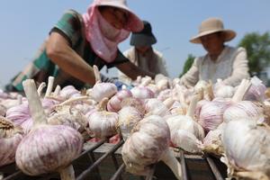(250521) -- BEIJING, 21 mayo, 2025 (Xinhua) -- Agricultores clasifican y empacan ajo, en la ciudad de Kaifeng, en la...