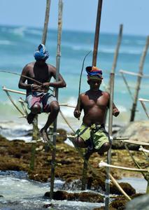 (250321) -- SRI LANKA, 21 marzo, 2025 (Xinhua) -- Pescadores con zancos son vistos en la costa de Kokgala, en...
