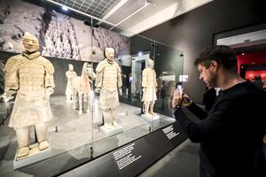 (251126) -- BUDAPEST, 26 noviembre, 2025 (Xinhua) -- Un visitante toma fotografías de las exhibiciones durante la vista previa para...