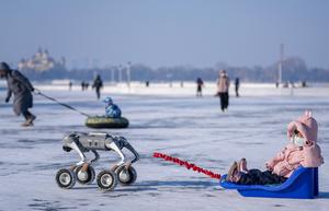 (260111) -- HARBIN, 11 enero, 2026 (Xinhua) -- Una niña circula en un trineo tirado por un perro robótico en...