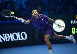 (251116) -- TURIN, 16 noviembre, 2025 (Xinhua) -- Imagen del 15 de noviembre de 2025 de Felix Auger-Aliassime devolviendo la...