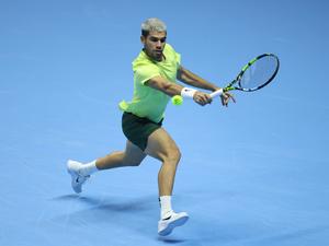 (251116) -- TURIN, 16 noviembre, 2025 (Xinhua) -- Imagen del 15 de noviembre de 2025 de Carlos Alcaraz devolviendo la...