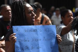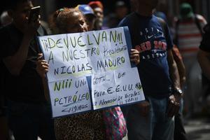 (260103) -- CARACAS, 3 enero, 2026 (Xinhua) -- Una mujer sostiene una pancarta en las inmediaciones del Palacio de Miraflores,...