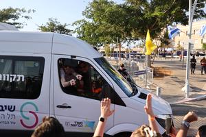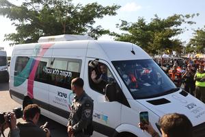 (251013) -- RAMAT GAN, 13 octubre, 2025 (Xinhua) -- Un rehén liberado llega a un hospital, en Ramat Gan, Israel,...
