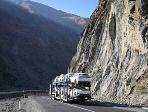 (251011) -- DUSAMBE, 11 octubre, 2025 (Xinhua) -- Un vehículo que transporta automóviles de marcas chinas circula por el tramo...