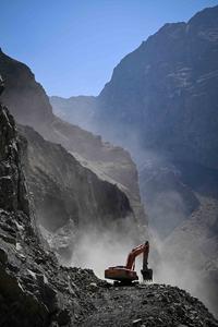 (251011) -- DUSAMBE, 11 octubre, 2025 (Xinhua) -- Una excavadora opera en el sitio de construcción del tramo de la...