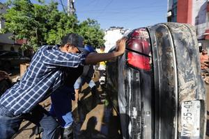 (251011) -- POZA RICA, 11 octubre, 2025 (Xinhua) -- Un joven descansa en una calle afectada por las lluvias, en...
