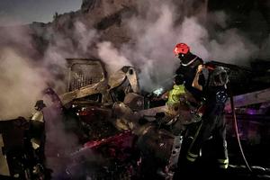(251011) -- MSAYLEH, 11 octubre, 2025 (Xinhua) -- Personas intentan apagar el fuego en vehículos pesados destruidos tras ataques aéreos...