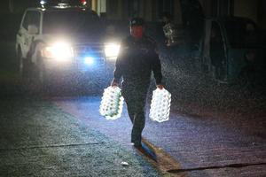 (250928) -- LONGXI, 28 septiembre, 2025 (Xinhua) -- Imagen del 27 de septiembre de 2025 de un policía cargando suministros...