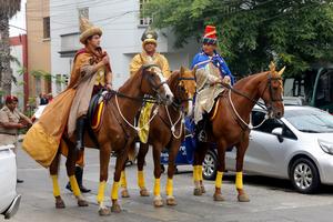 (260105) -- LIMA, 5 enero, 2026 (Xinhua) -- Integrantes de la Unidad Histórica de la Policía Montada-Potao, disfrazados de Los...