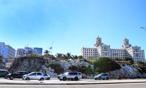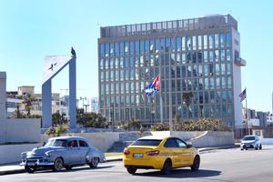 (260105) -- LA HABANA, 5 enero, 2026 (Xinhua) -- Automóviles circulan frente a una bandera nacional cubana a media asta,...