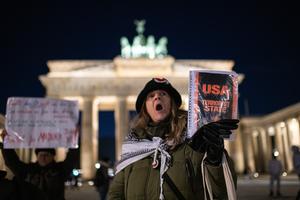 (260105) -- BERLIN, 5 enero, 2026 (Xinhua) -- Personas participan en una protesta en contra del ataque de Estados Unidos...
