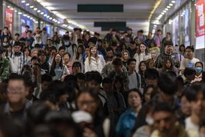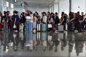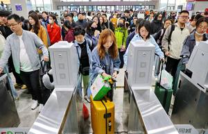 (250505) -- BEIJING, 5 mayo, 2025 (Xinhua) -- Pasajeros esperan el registro de sus boletos en la Estación de Ferrocarriles...