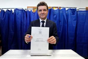 (250504) -- BUCAREST, 4 mayo, 2025 (Xinhua) -- El alcalde de Bucarest, Nicusor Dan, emite su voto durante la primera...