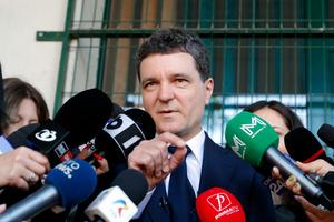 (250504) -- BUCAREST, 4 mayo, 2025 (Xinhua) -- El alcalde de Bucarest, Nicusor Dan, habla con los medios después de...
