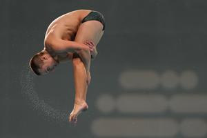 (250504) -- BEIJING, 4 mayo, 2025 (Xinhua) -- Cassiel Rousseau, de Australia, compite durante la final de plataforma de 10m...