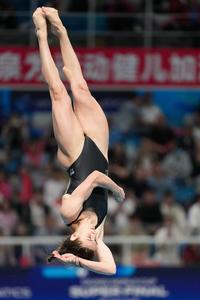 (250504) -- BEIJING, 4 mayo, 2025 (Xinhua) -- Maddison Keeney, de Australia, compite durante la final de trampolín de 3m...