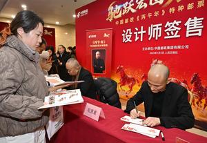 (260105) -- BEIJING, 5 enero, 2026 (Xinhua) -- Diseñadores de estampillas especiales conmemorativas del Año del Caballo firman estampillas para...