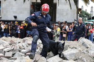 (250919) -- CIUDAD DE MEXICO, 19 septiembre, 2025 (Xinhua) -- Un bombero y su binomio canino participan en el Segundo...