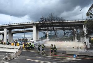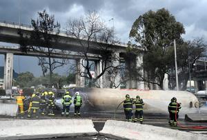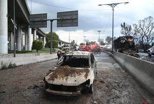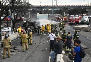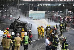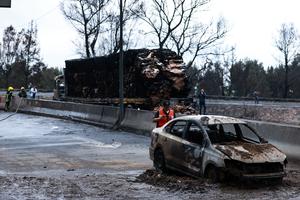 (250910) -- CIUDAD DE MEXICO, 10 septiembre, 2025 (Xinhua) -- Bomberos trabajan en el sitio donde se registró la volcadura...
