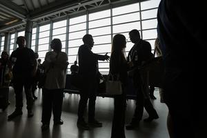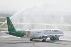 (250825) -- ZUMPANGO, 25 agosto, 2025 (Xinhua) -- Personas esperan para abordar el primer vuelo de la aeronave EMBRAER E-195...