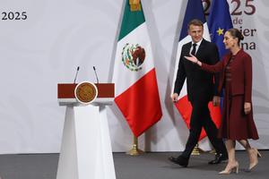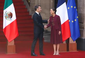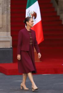 (251107) -- CIUDAD DE MEXICO, 7 noviembre, 2025 (Xinhua) -- La presidenta mexicana, Claudia Sheinbaum, asiste una ceremonia de bienvenida...