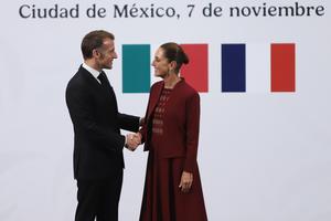 (251107) -- CIUDAD DE MEXICO, 7 noviembre, 2025 (Xinhua) -- La presidenta mexicana, Claudia Sheinbaum (d), estrecha la mano del...