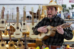 (250612) -- CIUDAD DE MEXICO, 12 junio, 2025 (Xinhua) -- Un artesano toca un instrumento musical elaborado por él durante...