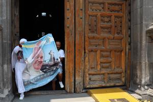 (250421) -- CIUDAD DE MEXICO, 21 abril, 2025 (Xinhua) -- Personas sostienen una pancarta con la imagen del papa Francisco...
