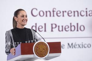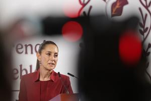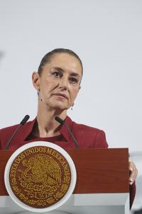 (250402) -- CIUDAD DE MEXICO, 2 abril, 2025 (Xinhua) -- La presidenta mexicana, Claudia Sheinbaum, habla durante su conferencia de...
