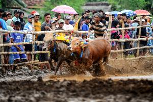 (251228) -- PROBOLINGGO, 28 diciembre, 2025 (Xinhua) -- Imagen del 27 de diciembre de 2025 de personas y sus toros...