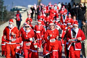(251228) -- SKOPIE, 28 diciembre, 2025 (Xinhua) -- Personas disfrazadas de Santa Claus participan en la tradicional carrera de Santa...