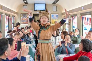 (251228) -- HARBIN, 28 diciembre, 2025 (Xinhua) -- Turistas observan una presentación a bordo de un tren turístico, en la...