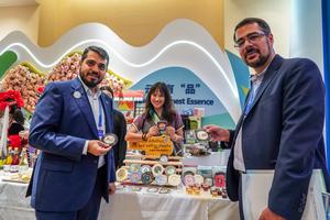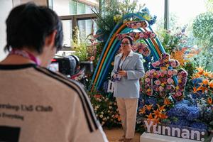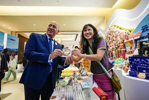 (250906) -- KUNMING, 6 septiembre, 2025 (Xinhua) -- Un invitado (i) se toma una fotografía con una trabajadora previo a...