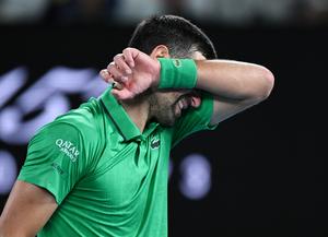 (260201) -- MELBOURNE, 1 febrero, 2026 (Xinhua) -- Novak Djokovic reacciona durante el partido final de individuales masculinos entre Carlos...