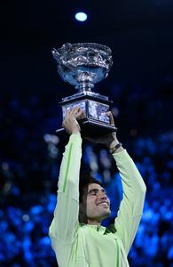 (260201) -- MELBOURNE, 1 febrero, 2026 (Xinhua) -- Carlos Alcaraz festeja con el trofeo después de ganar el partido final...