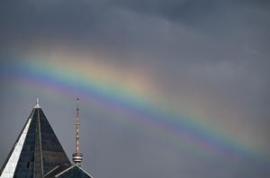 (250818) -- ALMATY, 18 agosto, 2025 (Xinhua) -- Imagen del 18 de agosto de 2025 de un arcoíris en el...