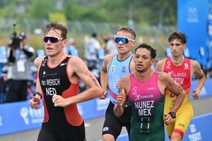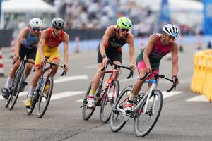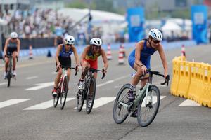 (250817) -- CHENGDU, 17 agosto, 2025 (Xinhua) -- Atletas compiten durante la final de relevos mixtos de duatlón en los...