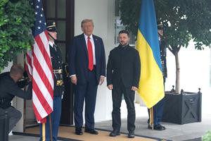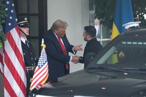 (250818) -- WASHINGTON, 18 agosto, 2025 (Xinhua) -- El presidente estadounidense, Donald Trump (3-d), recibe al presidente ucraniano, Volodymyr Zelensky...