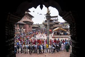 (250816) -- LALITPUR, 16 agosto, 2025 (Xinhua) -- Devotos hacen fila para adorar al Señor Krishna durante el festival Krishna...
