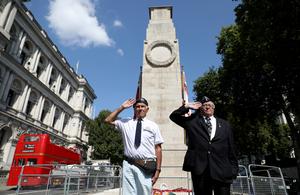 (250816) -- LONDRES, 16 agosto, 2025 (Xinhua) -- Imagen del 15 de agosto de 2025 de dos veteranos saludando frente...