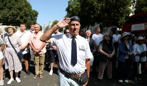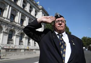 (250816) -- LONDRES, 16 agosto, 2025 (Xinhua) -- Imagen del 15 de agosto de 2025 de un veterano saludando frente...
