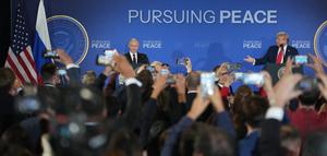 (250815) -- ANCHORAGE, 15 agosto, 2025 (Xinhua) -- El presidente estadounidense, Donald Trump (d-atrás), y el presidente ruso, Vladimir Putin...
