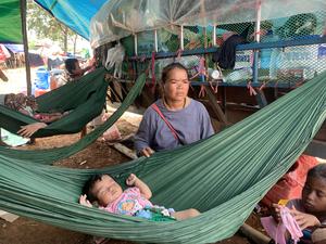 (250729) -- ODDAR MEANCHEY, 29 julio, 2025 (Xinhua) -- Una madre camboyana cuida a su hijo en un refugio, en...